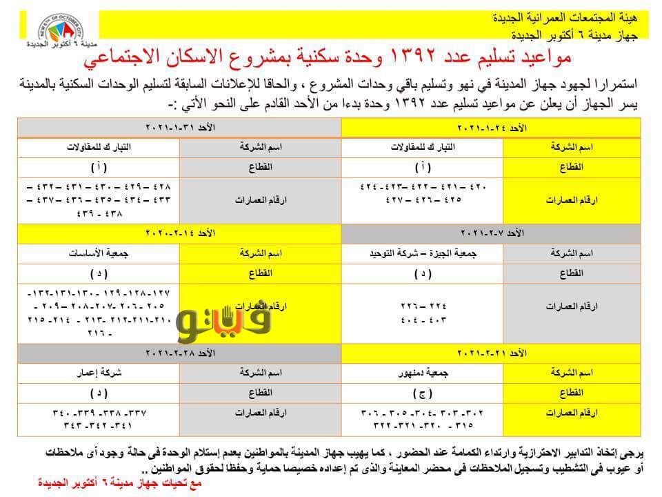 أعلن جهاز مدينة أكتوبر الجديدة بدء تسليم ١٣٩٢ وحدة سكنية بمشروع الاسكان الاجتماعي للمواطنين الحاجزين، بمنطقة الـ ٨٠٠ فدان قطاعات (أ - ج - د) وذلك الأحد المقبل ٢٤ يناير ٢٠٢١.