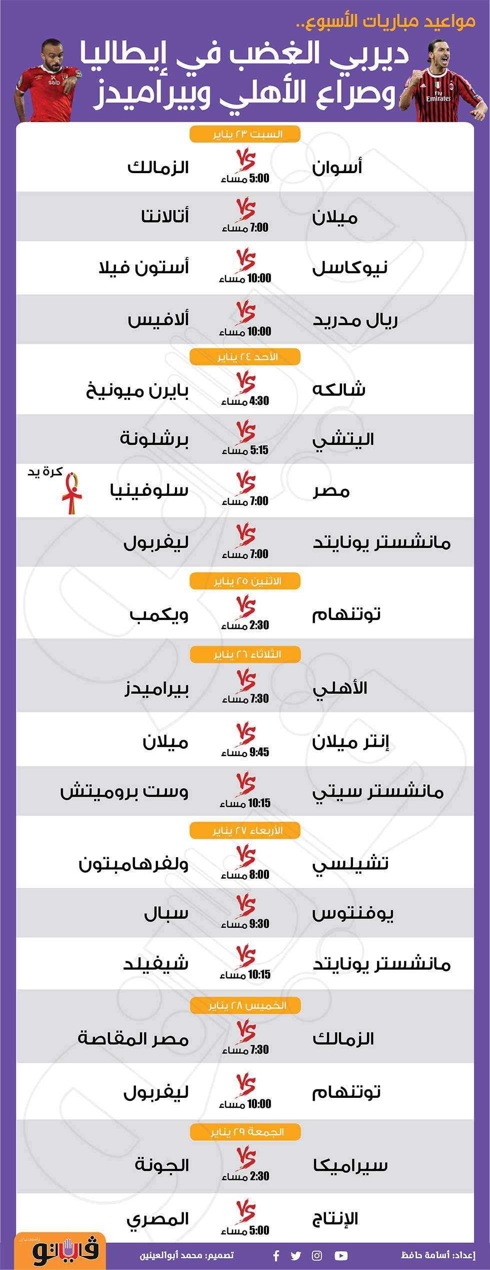 مواعيد مباريات الأسبوع.. ديربي الغضب في إيطاليا وصراع الأهلي وبيراميدز| إنفو جراف الجمعة 22/يناير/2021 - 07:14 م 1/22/2021 7:14:47 PM الأهلي أسامة حافظ شارك طباعة 18 حجم الخط شارك طباعة مواعيد مباريات ليفربول مواعيد مباريات الاهلي مواعيد مباريات الأسبوع