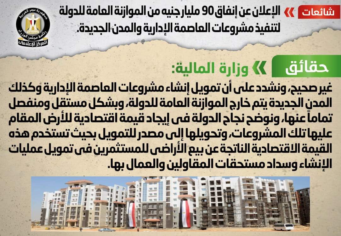 وتواصل المركز الإعلامي لمجلس الوزراء بالتواصل مع وزارة المالية، والتي نفت تلك الأنباء، مُؤكدةً أنه لا صحة للإعلان عن إنفاق 90 مليار جنيه من الموازنة العامة للدولة لتنفيذ مشروعات العاصمة الإدارية والمدن الجديدة.