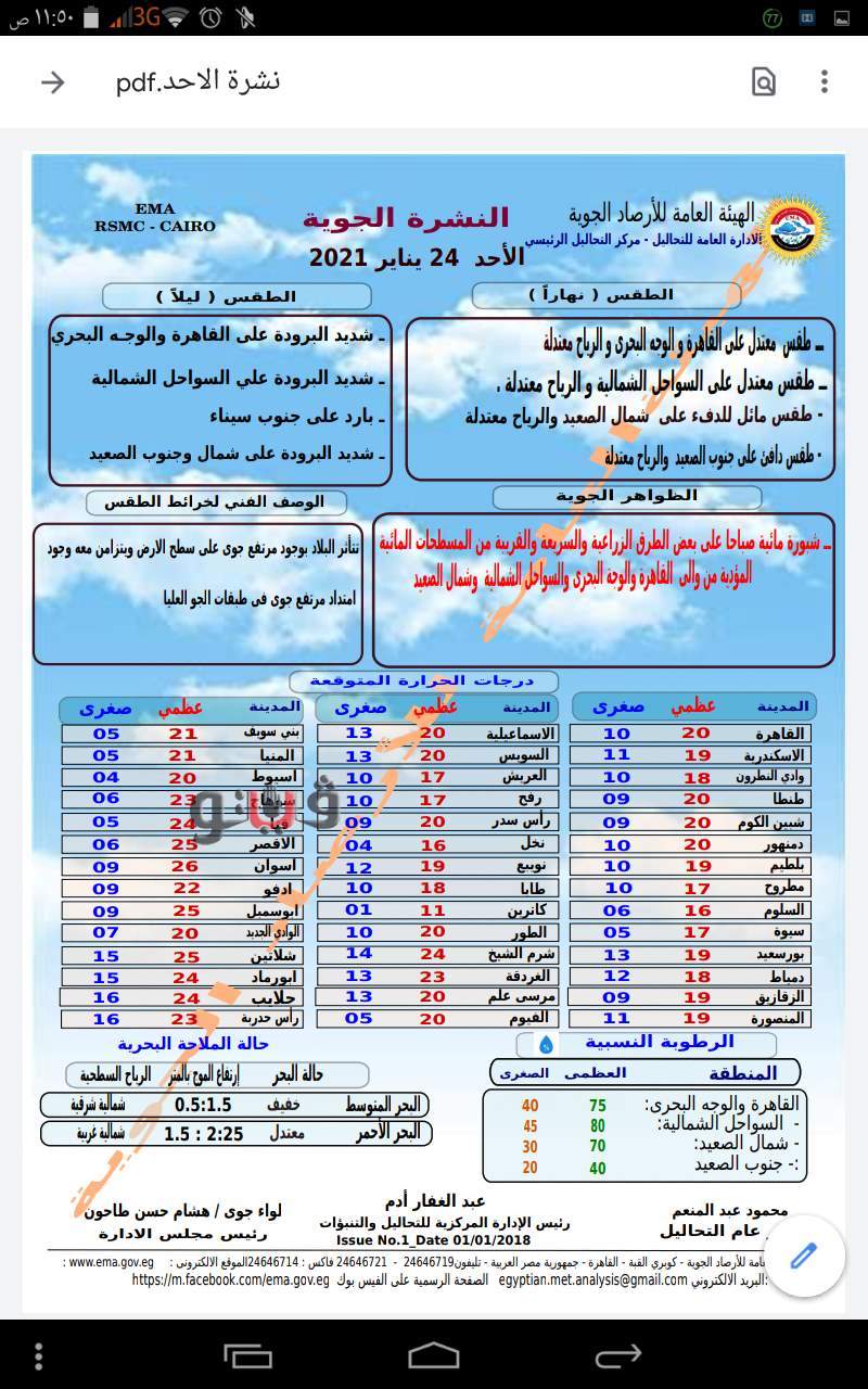 وقالت هيئة الأرصاد إنه يسود طقس، شديد البرودة ليلا على القاهرة والوجه البحري، وعلى السواحل الشمالية، وبارد على جنوب سيناء، وشديد البرودة على جنوب سيناء وجنوب الصعيد.