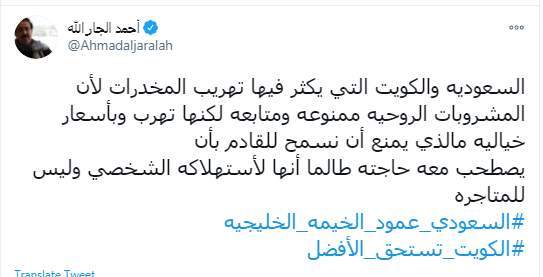 وكتب أحمد الجار الله "السعودية والكويت التي يكثر فيها تهريب المخدرات لأن المشروبات الروحية ممنوعة ومتابعة لكنها تهرب وبأسعار خيالية مالذي يمنع أن نسمح للقادم بأن يصطحب معه حاجته طالما أنها لأستهلاكه الشخصي وليس للمتاجره.. #السعودي_عمود_الخيمة_الخليجية #الكويت_تستحق_الأفضل"