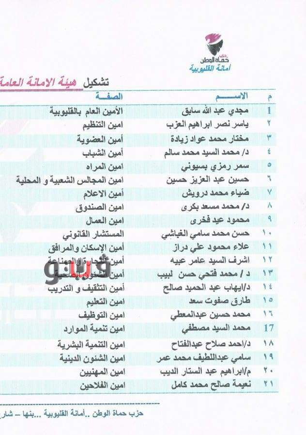 وتم تشكيل الأمانة العامة لحزب حماة الوطن في القليوبية برئاسة مجدي سابق واعتماد الأمانات النوعية والمراكز والمدن لعام 2021 .