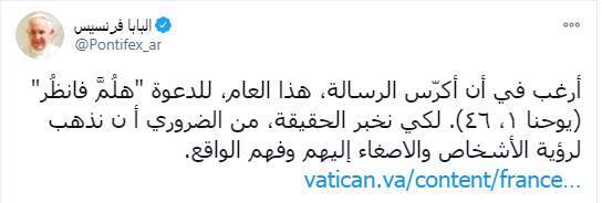 وكتب البابا فرنسيس تغريدة على تويتر: "أرغب في أن أكرّس الرسالة، هذا العام، للدعوة "هلُمَّ فانظُر"(يوحنا ١، ٤٦)، لكي نخبر الحقيقة، من الضروري أن نذهب لرؤية الأشخاص والاصغاء إليهم وفهم الواقع"