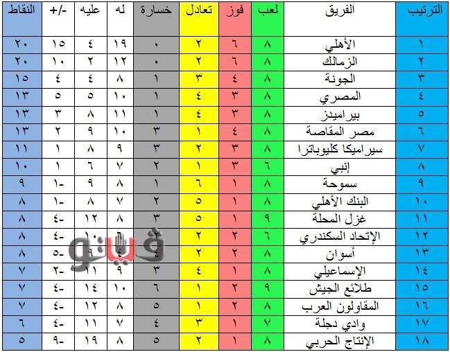 تنشر "فيتو" جدول ترتيب الدوري المصري الممتاز، بعد انتهاء مباراتي اليوم السبت، ضمن منافسات الجولة التاسعة من المسابقة، حيث أقيمت اليوم مباراتين جاءت نتائجها على النحو الآتي: