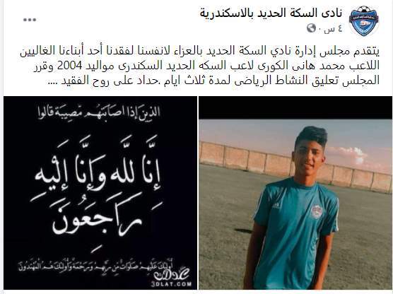 وعلى صعيد آخر أكد النادي عبر صفحة تهتم بأخبار النادي على موقع التواصل الاجتماعي فيس بوك: "تقدم مجلس إدارة نادي السكة الحديد السكندري بالعزاء لأحد أبنائنا الغاليين اللاعب محمد هاني الكوري لاعب السكة الحديد السكندري مواليد 2004 وقرر المجلس تعليق النشاط الرياضي لمدة ثلاثة أيام حداد على روح الفقيد".