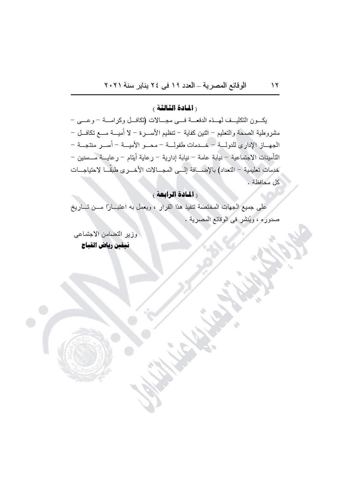 نشرت جريدة الوقائع المصرية في عددها رقم 19، الصادر في 24 يناير 2021، قرار وزارة التضامن الاجتماعي رقم 531 لسنة 2020، بشأن تكليف الشباب من الجنسين ممن يتمتعون بجنسية مصر العربية لأداء الخدمة العامة لمدة.