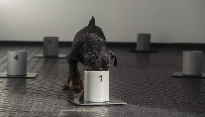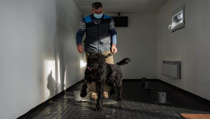تشم هذه الكلاب الثلاثة 6 حاويات تضم إما قطعة قماش عليها رائحة أشخاص مصابين بكورونا أو آخرين غير مصابين أو عينات مزيفة، ويتعين عليها التكهن بأي منها عائد إلى شخص مريض.