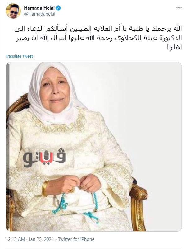 وكتب حمادة هلال على صفحته الرسمية على موقع التدوينات القصيرة "تويتر": "الله يرحمك يا طيبة يا أم الغلابة الطيبين.. أسألكم الدعاء إلى الدكتورة عبلة الكحلاوى رحمة الله عليها.. أسأل الله أن يصبر أهلها".