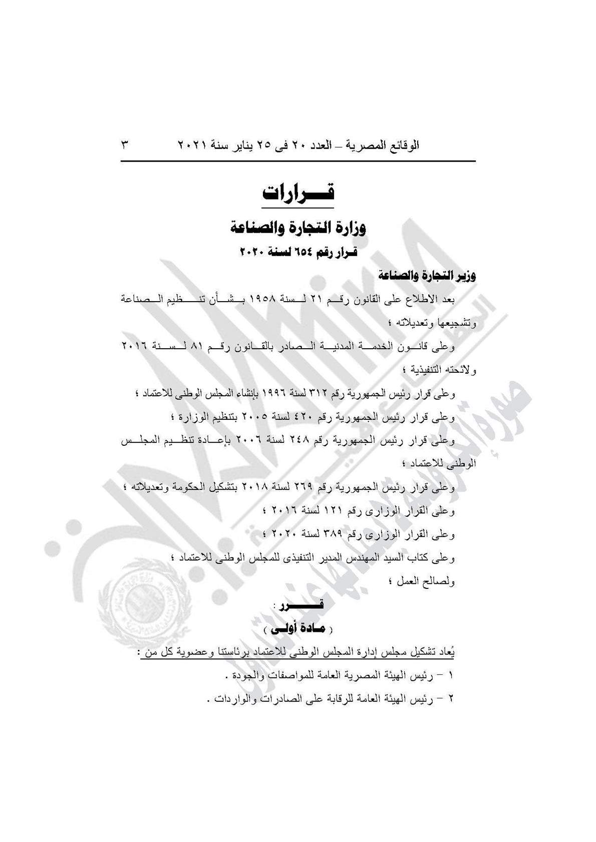 وجاء القرار رقم 654 لسنة 2020، بشأن إعادة تشكيل مجلس إدارة المجلس الوطني للاعتماد برئاسة وزير التجارة والصناعة، و14 عضوًا منهم رئيس الهيئة المصرية العامة للمواصفات والجودة. ورئيس الهيئة العامة للرقابة على الصادرات والواردات، ورئيس اتحاد الصناعات المصرية، ورئيس افدارة المركزية لمعامل وزارة الصحة، ورئيس اتحاد الغرف التجارية ورئيس المعهد القومي للجودة، وغيرهم.