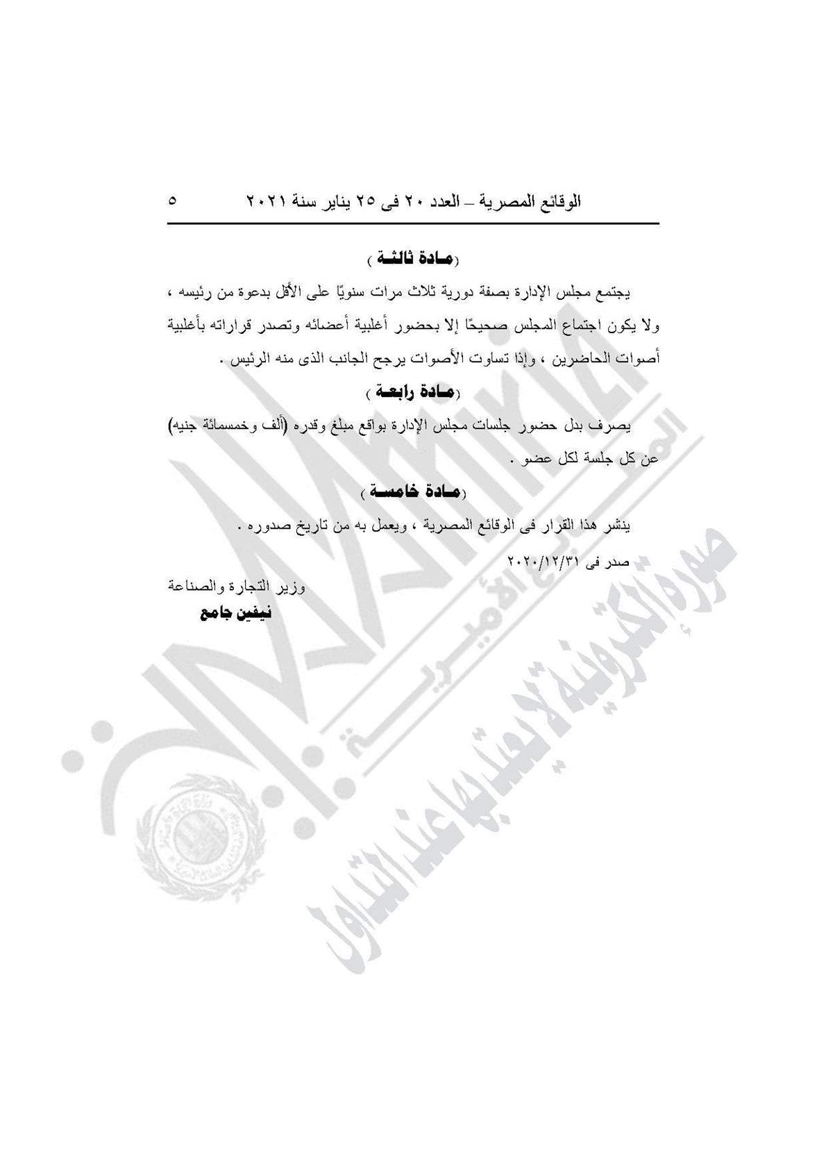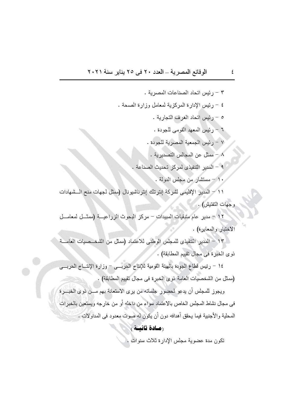 نشرت جريدة الوقائع المصرية في عددها رقم 20، الصادر في 25 يناير 2021، قراري وزارة التجارة والصناعة بشأن إعادة تشكيل مجلس إدارة المجلس الوطني للاعتماد برئاسة وزير التجارة والصناعة وعضوية 14، مع استبدال عضوية رئيس المعهد القومي للمعايرة بعضوية رئيس المعهد القومي للجودة.