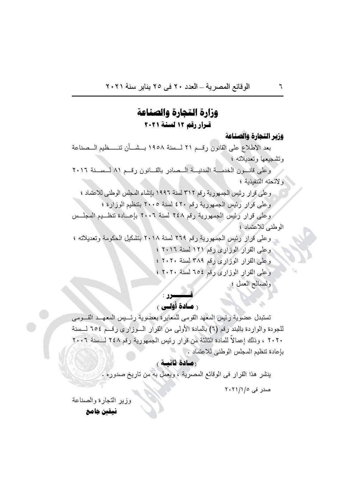 والقرار رقم 12 لسنة 2021، بشأن باستبدال عضوية رئيس المعهد القومي للمعايرة بعضوية رئيس المعهد القومي للجودة والواردة بالبند رقم 6 بالمادة الأولى من القرار الوزاري رقم 654 لسنة 2020، إعمالًا للمادة الثالثة من قرار رئيس الجمهورية رقم 248 لسنة 2006، بإعادة تنظيم المجلس الوطني للاعتماد.