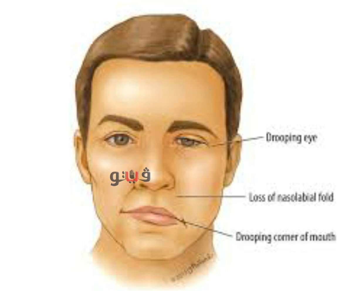 الوجه، مما يسبب نزوله للأسفل، مع اعوجاج في الفم، مع عدم القدرة على غلق العين، ومن