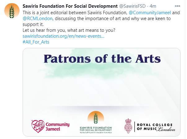 وكتبت مؤسسة ساويرس تغريدة على تويتر قالت فيها: "هذه افتتاحية مشتركة بين مؤسسة ساويرس ومجتمع جميل والكلية الملكية للموسيقى لمناقشة أهمية الفن وسبب حرصنا على دعمه.. دعنا نسمع منك ما هو الفن بالنسبة لك؟".
