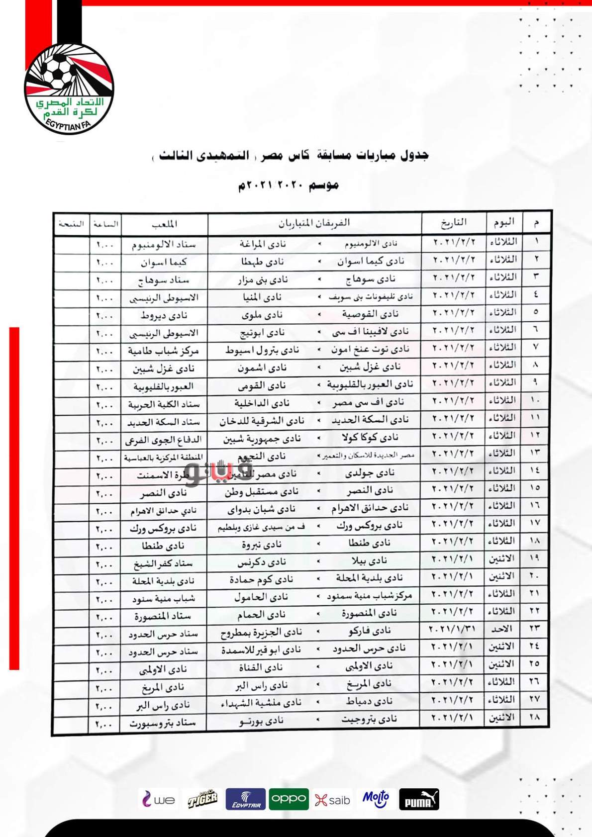 أعلنت إدارة المسابقات بالاتحاد المصري لكرة القدم، جدول مباريات الدور التأهيلي الثالث لمسابقة كأس مصر موسم 2020-2021 على النحو التالي: