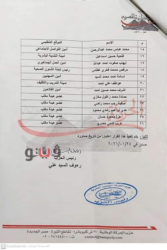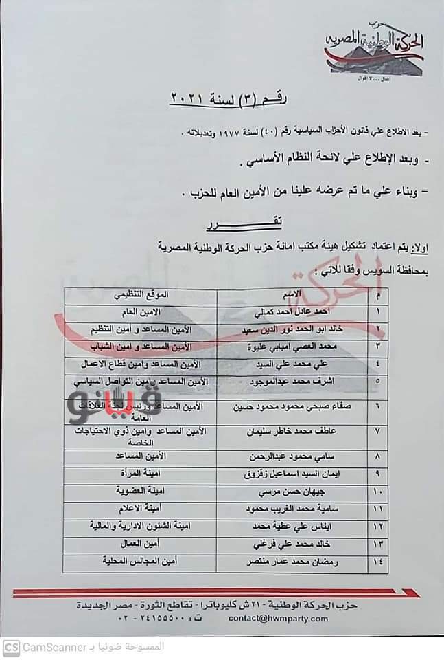 تقرر أولا: يتم اعتماد تشكيل هيئة مكتب امانة حزب الحركة الوطنية المصرية بمحافظة السويس وفقا للاتي :