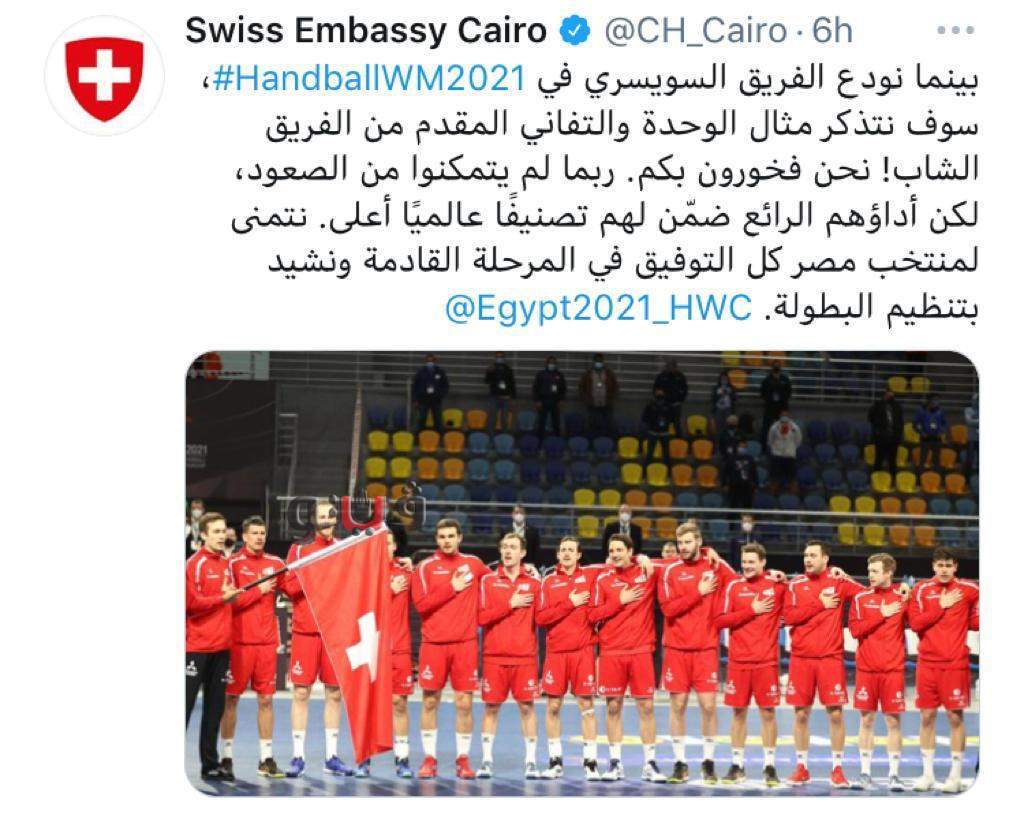 أشادت السفارة السويسرية في مصر بتنظيم بطولة كأس العالم لكرة اليد 2021 التي تستضيفها مصر، مؤكدين أن الأجواء كانت رائعة.