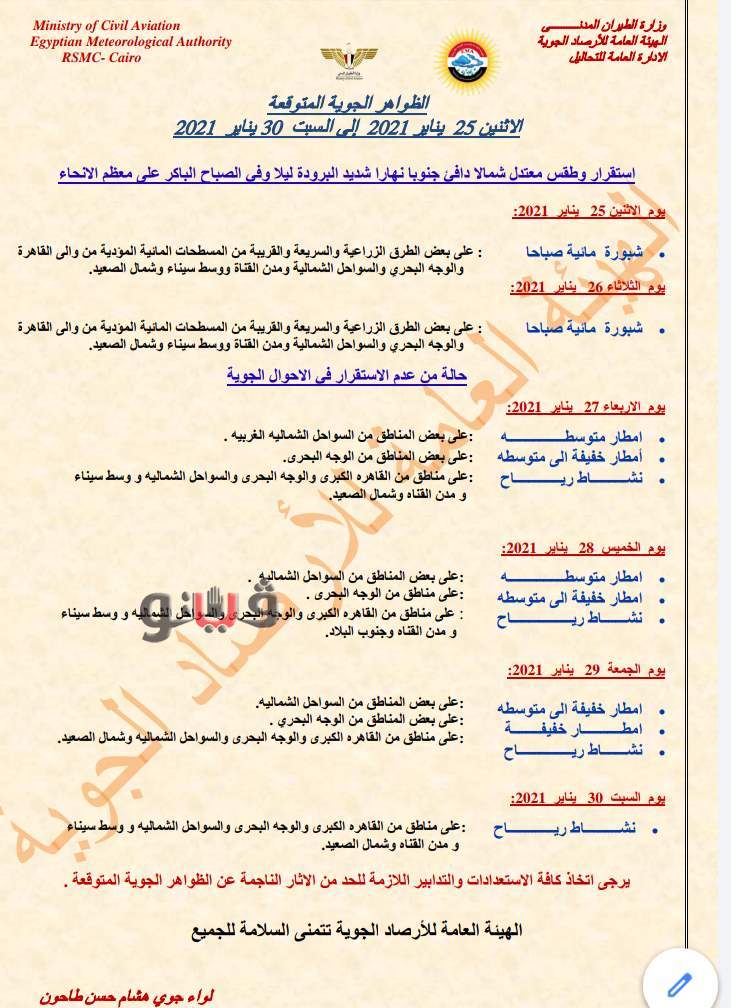وتبدأ حالة من عدم الاستقرار يوم الأربعاء حتى يوم الخميس، وتتمثل فى نشاط للرياح على الوجه البحرى والقاهرة الكبرى والسواحل الشمالية والصعيد و أمطار خفيفة إلى متوسطة على السواحل الشمالية الغربية والسواحل الشرقية