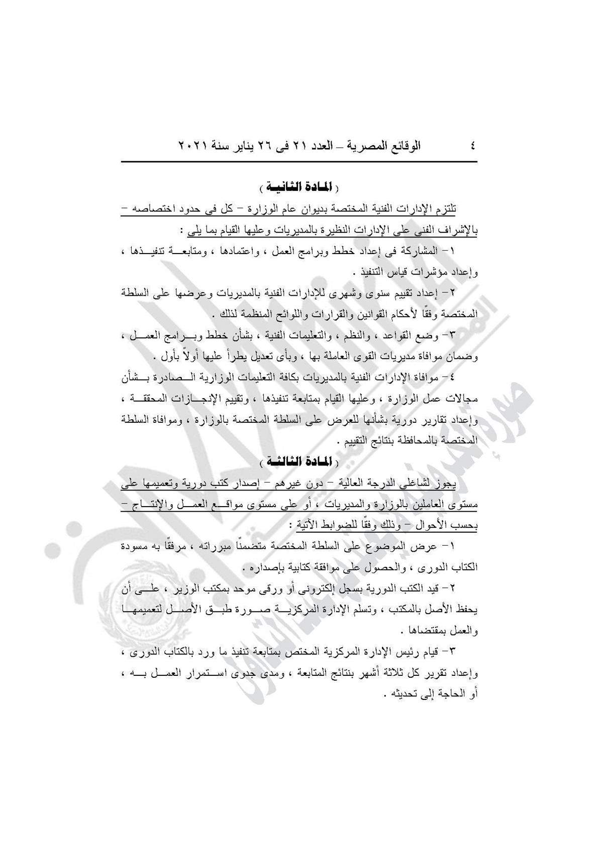 وجاء في نص المادة الثانية "تلتزم الإدارات الفنية المختصة بديوان عام الوزارة بالإشراف الفني على الإدارات النظيرة بالمديريات.
