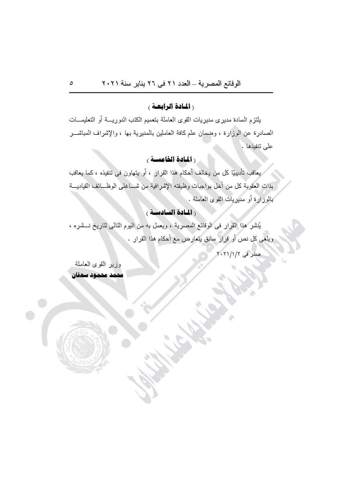 نشرت جريدة الوقائع المصرية في عددها رقم 21، الصادر في 26 يناير 2021، قرار وزارة القوى العاملة رقم 1 لسنة 2021، بشأن تولى مديريات القوى العاملة بالمحافظات تنفيذ السياسات العامة لتنمية الموارد البشرية على المستوى المحلي.