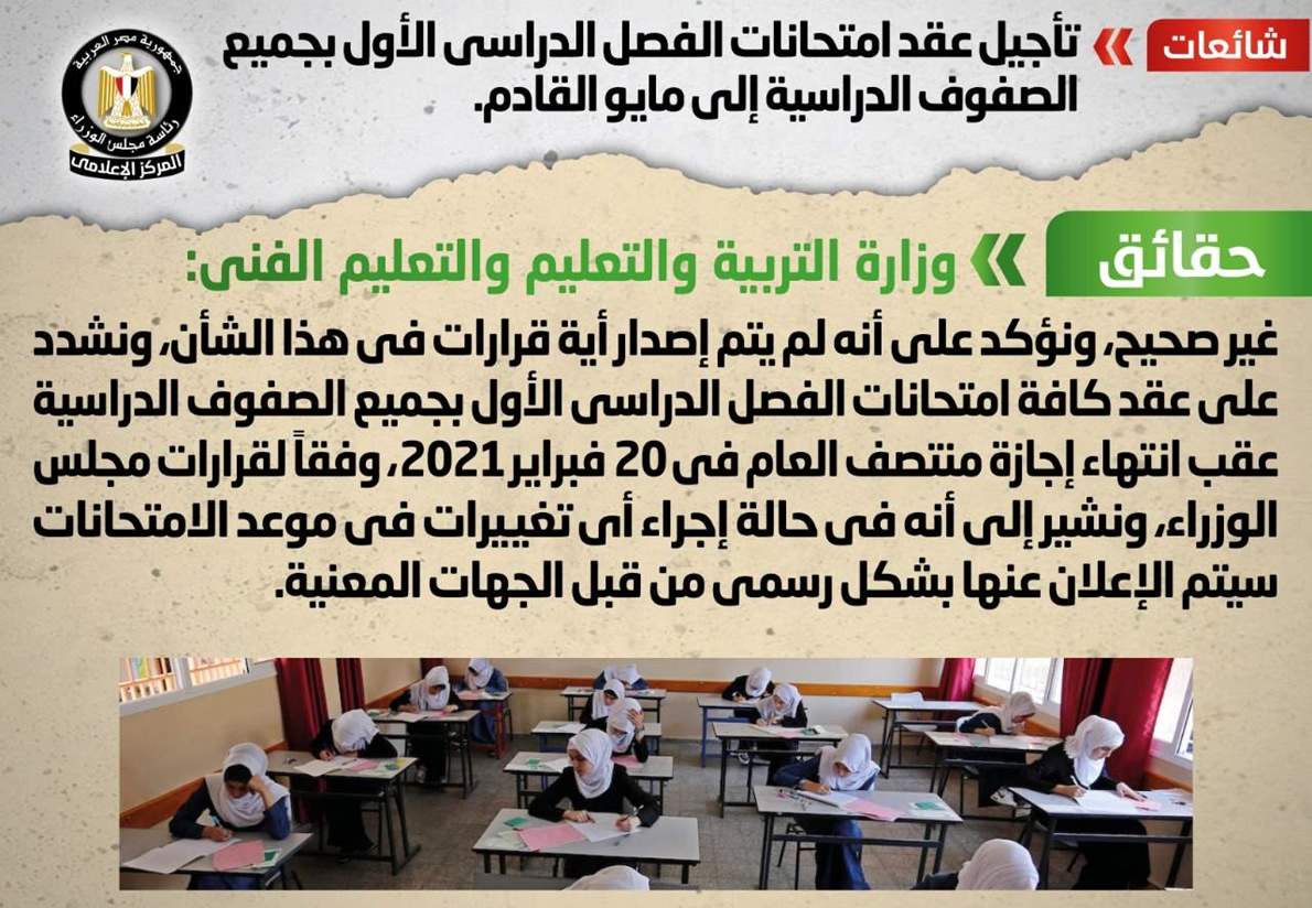 وتواصل المركز الإعلامي لمجلس الوزراء مع وزارة التربية والتعليم والتعليم الفني، والتي نفت تلك الأنباء، مُؤكدةً أنه لا صحة لتأجيل عقد امتحانات الفصل الدراسي الأول بجميع الصفوف الدراسية إلى مايو القادم، وأنه لم يتم إصدار أية قرارات في هذا الشأن.