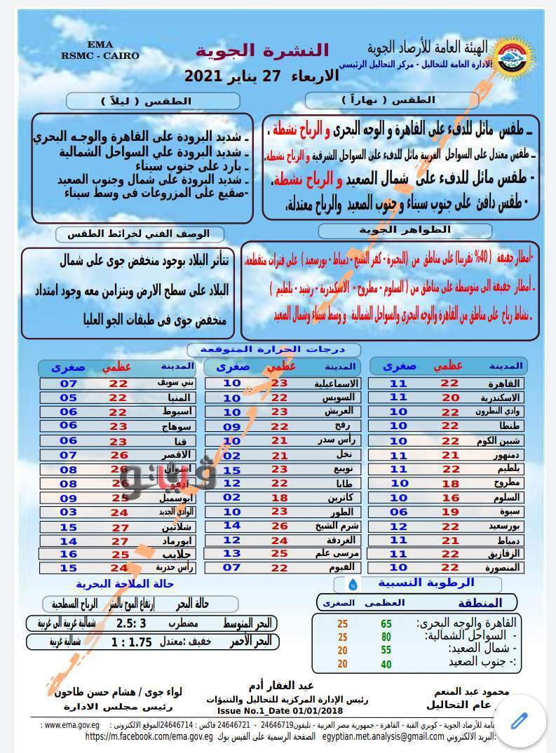 كما يسود طقس شديد البرودة ليلا على القاهرة والوجه البحري وعلى السواحل الشمالية وبارد على جنوب سيناء وشديد البرودة على جنوب سيناء وجنوب الصعيد.