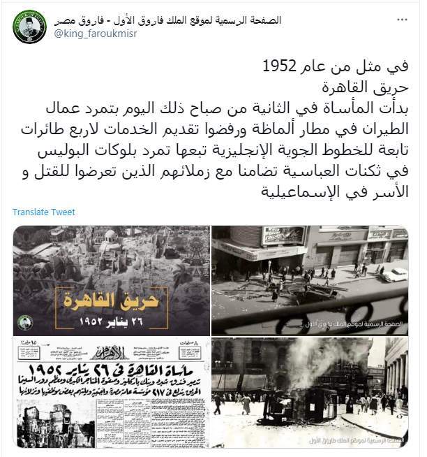 وكتبت الصفحة الرسمية لموقع الملك فاروق تغريدة على تويتر "في مثل من عام 1952 حريق القاهرة.. بدأت المأساة في الثانية من صباح ذلك اليوم بتمرد عمال الطيران في مطار ألماظة ورفضوا تقديم الخدمات لاربع طائرات تابعة للخطوط الجوية الإنجليزية تبعها تمرد بلوكات البوليس في ثكنات العباسية تضامنا مع زملائهم الذين تعرضوا للقتل و الأسر في الإسماعيلية"