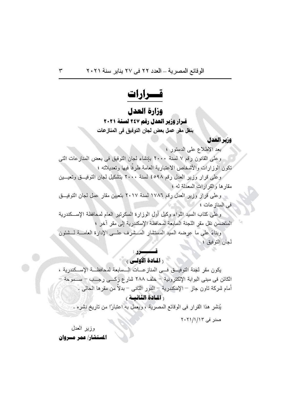 نشرت جريدة الوقائع المصرية في عددها رقم 22، الصادر في 27 يناير 2021، قرار وزير العدل المستشار عمر مروان رقم 247 لسنة 2021، بنقل مقر عمل بعض لجان التوفيق في المنازعات.