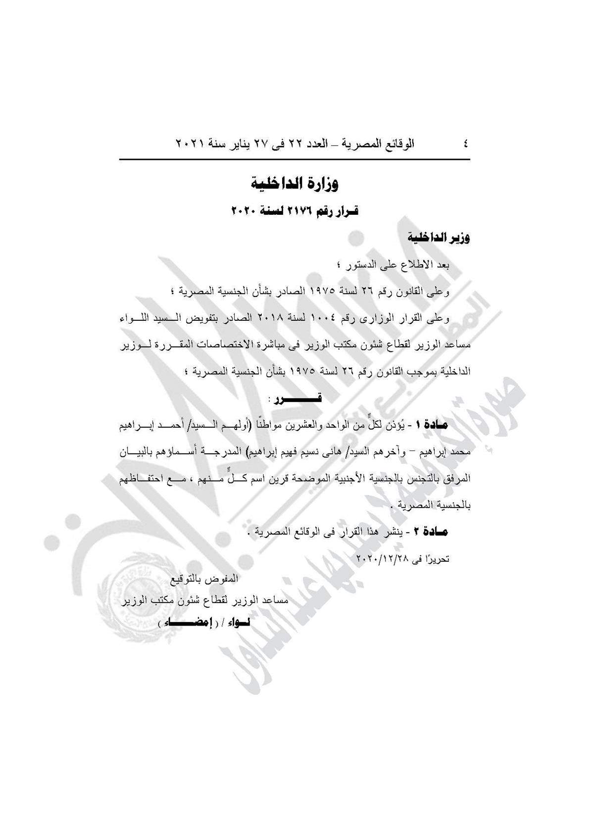 القرار رقم 2176 لسنة 2020، بشأن الأذن لـ 21 مواطنًا (أولهم أحمد إبراهيم محمد إبراهيم، وآخرهم هاني نسيم فهيم إبراهيم) المدرجة أسماؤهم بالبيان، بالتجنس بالجنسية الأجنبية الموضحة قرين اسم كل منهم، مع احتفاظهم بالجنسية المصرية.