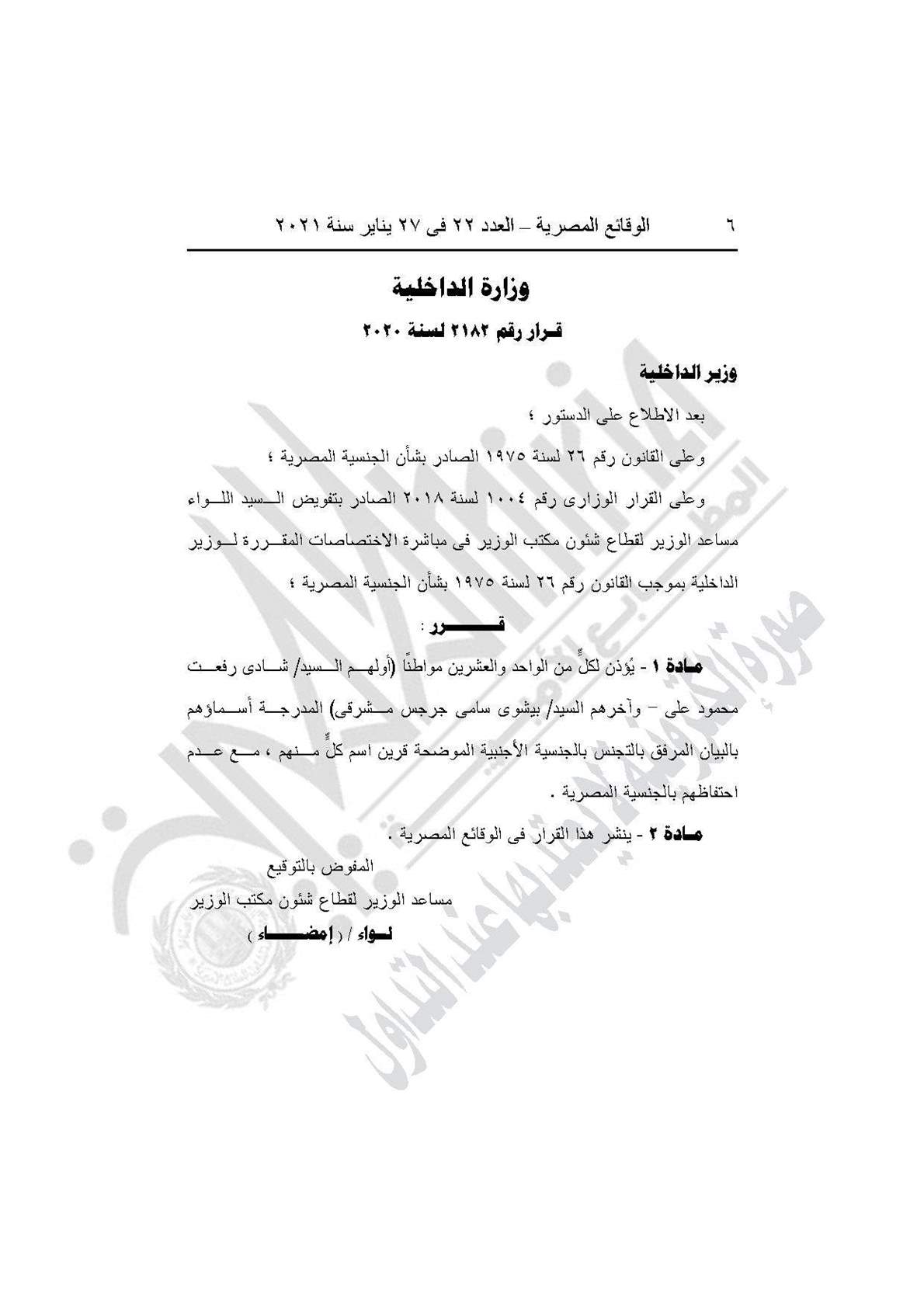 القرار رقم 2182 لسنة 2020، بشأن الأذن لـ 21 مواطنًا (أولهم شادي رفعت محمود علي، وآخرهم بيشوي سامي جرجس مشرقي) المدرجة أسماؤهم بالبيان، بالتجنس بالجنسية الأجنبية الموضحة قرين اسم كل منهم، مع عدم احتفاظهم بالجنسية المصرية.