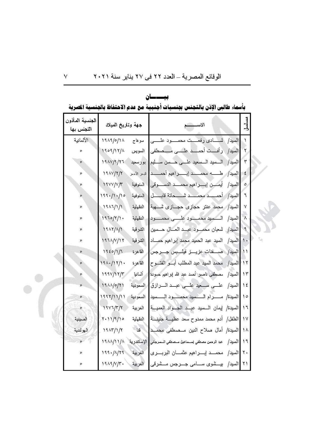 نشرت جريدة الوقائع المصرية في عددها رقم 22، الصادر في 27 يناير 2021، قرارى وزارة الداخلية بسحب الجنسية المصرية من 21 مواطنًا، والأذن لـ21 مواطنًا التجنس بالجنسية الأجنبية مع احتفاظهم بالجنسية المصرية.
