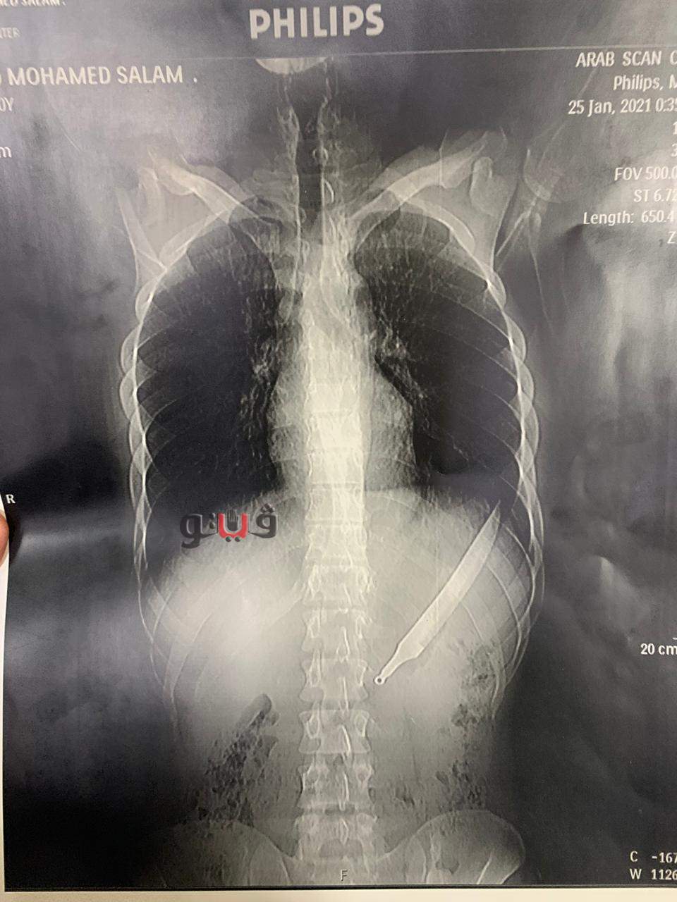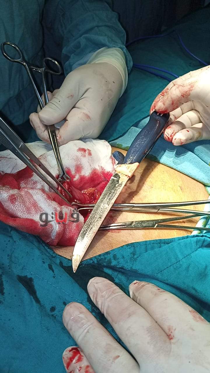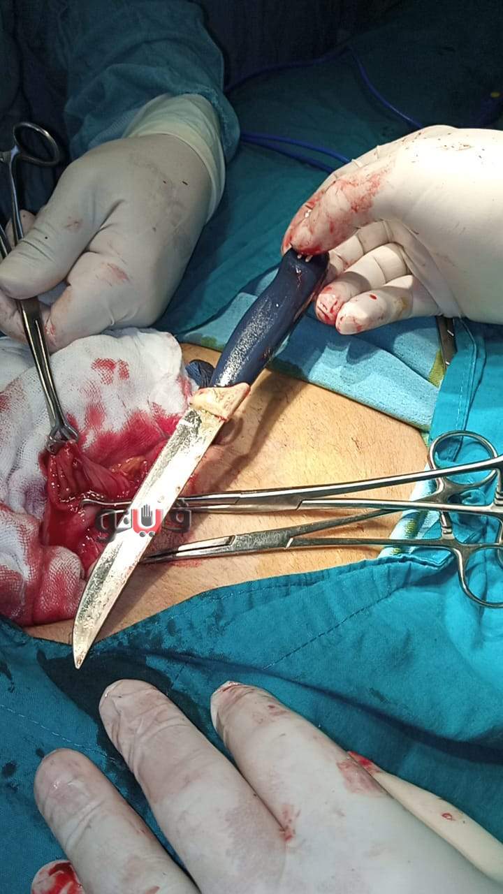 وبعمل الأشعات والفحوصات تبين وجود جسم غريب، وتمكن الفريق الطبي من إجراء عملية جراحية لاستخراج الجسم الغريب (سكين مطبخ)، وتكللت العملية بالنجاح وخرج المريض بحالة مستقرة.