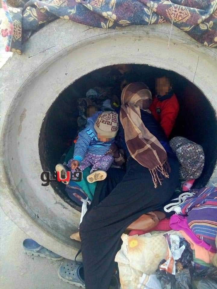 تداول رواد موقع التواصل الاجتماعي فيس بوك بالإسكندرية صورا لمواطن وزوجته وأولاده يعيشون في ماسورة للصرف الصحي وسط القمامة والكلاب الضالة في منطقة الفلكي شرق المدينة.