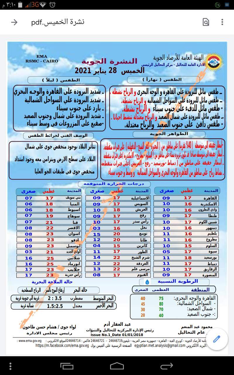 وتنخفض درجات الحرارة انخفاضا شديدا ملحوظا على أغلب البلاد، ومن المتوقع سقوط أمطار خفيفة إلى متوسطة على مناطق من الوجه البحرى على فترات متقطعة ، وسقوط أمطار متوسطة على بعض مناطق السواحل الشمالية على فترات متقطعة .