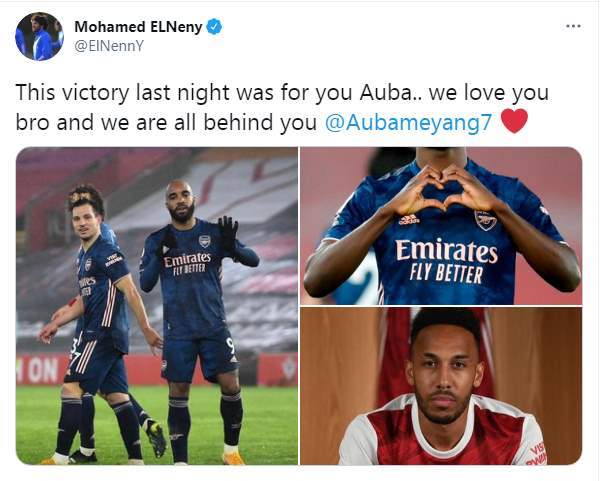 وكتب محمد النني تغريدة على تويتر "هذا النصر، ليلية أمس، كان لك أوبا.. نحبك يا أخي وكلنا نقف خلفك أوباميانج"