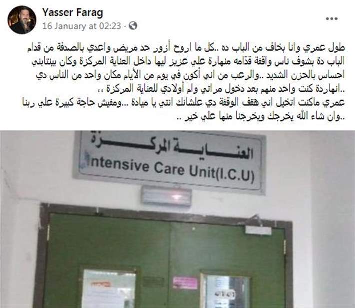 على الجانب الآخر، كانت زوجة الفنان ياسر فرج قد دخلت العناية المركزة بأحد مستشفيات العزل بعد تراجع حالتها الصحية، ووقتها نشر «ياسر» عبر حسابه الشخصي على موقع التواصل الاجتماعي فيسبوك وكتب: «طول عمري وانا بخاف من الباب ده.. كل ما اروح أزور حد مريض واعدي بالصدفة من قدام الباب دة بشوف ناس واقفة قدّامه منهارة على عزيز ليها داخل العناية المركزة وكان بينتابني إحساس بالحزن الشديد والرعب من إني أكون في يوم من الأيام مكان واحد من الناس دي.. النهارده كنت واحد منهم بعد دخول مراتي وأم أولادي للعناية المركزة، عمري ما كنت أتخيل إني هقف الوقفة دي علشانك أنتى يا ميادة.. ومفيش حاجة كبيرة على ربنا.. وإن شاء الله يخرجك ويخرجنا منها على خير».