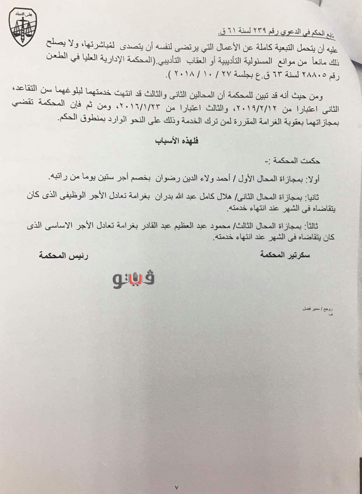 وأصدرت المحكمة حكمها بحضور المستشار فوزي عبد الهادي، ممثل النيابة الإدارية بخصم أجر 60 يومًا من راتب ولاء الدين رضوان، وتغريم هلال كامل عبد الله بما يعادل الأجر الوظيفي الذي كان يتقاضاه في الشهر عند انتهاء خدمته، وتغريم محمود عبد العظيم عبد القادر بما يعادل الأجر الأساسي الذي كان يتقاضاه في الشهر عند انتهاء خدمته.