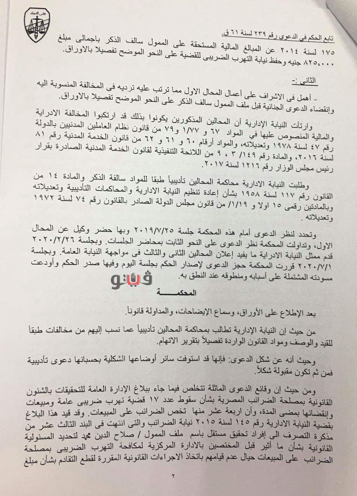 وأهمل هلال كامل عبد الله، مدير عام مكافحة التهرب الضريبي بمنطقة جنوب القاهرة أهمل في الإشراف على أعمال المحال الأول مما ترتب عليه ترديه في المخالفة المنسوبة اليه وانقضاء الدعوى الجنائيه قبل ملف الممول.