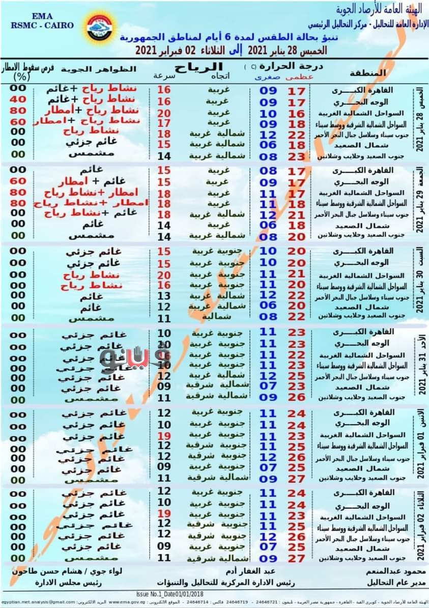 وتنخفض درجات الحرارة انخفاضا شديدا ملحوظا على أغلب البلاد، ومن المتوقع سقوط أمطار خفيفة إلى متوسطة على مناطق من الوجه البحرى على فترات متقطعة، وسقوط أمطار متوسطة على بعض مناطق السواحل الشمالية على فترات متقطعة.