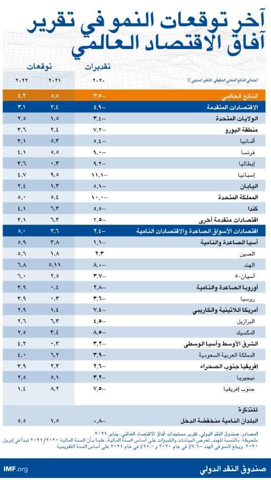 وأضاف التقرير أنه وسط هذه الأجواء الاستثنائية من عدم اليقين، من المتوقع أن يحقق الاقتصاد العالمي نموًا قدره 5,5% في عام 2021 وبنسبة قدرها 4,2% في عام 2022. "تم تعديل تنبؤاتنا لعام 2021 بزيادة قدرها 0,3 نقطة مئوية مقارنة بالتنبؤات السابقة، مما يعكس توقعات بازدياد قوة النشاط الاقتصادي في وقت لاحق من العام الجاري مدفوعا بتطورات لقاحات فيروس كورونا ونتيجة الدعم الإضافي من السياسات في عدد قليل من الاقتصادات الكبرى"، بحسب توقعات صندوق النقد.