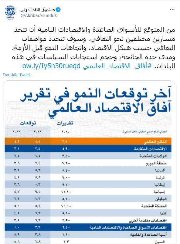 وكتب صندوق النقد الدولي تغريدة على تويتر "من المتوقع للأسواق الصاعدة والاقتصادات النامية أن تتخذ مسارين مختلفين نحو التعافي. وسوف تتحدد مواصفات التعافي حسب هيكل الاقتصاد، واتجاهات النمو قبل الأزمة، ومدى حدة الجائحة، وحجم استجابات السياسات في هذه البلدان"