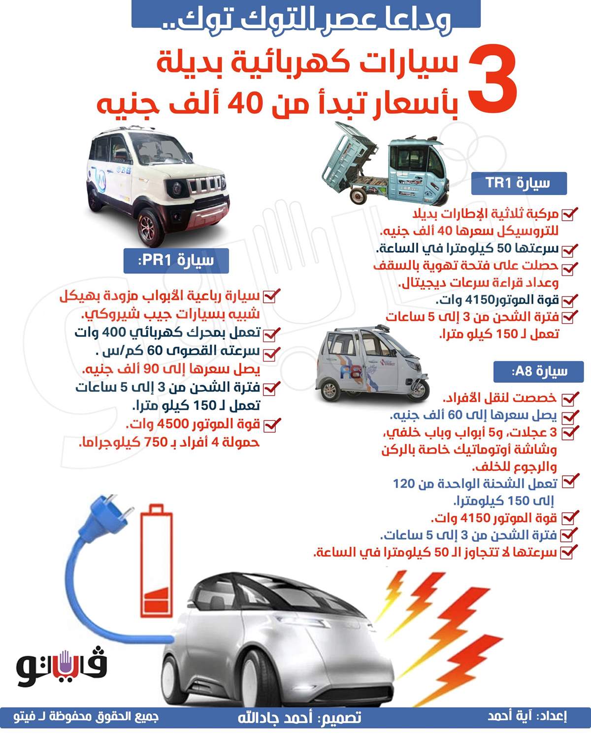 طرحت عدد من الشركات 3 سيارات كهربائية بالأسواق بأسعار مميزة تعمل كبديل للتوك توك والتروسيكل ويجرى حاليا تدشين محطات الشحن.