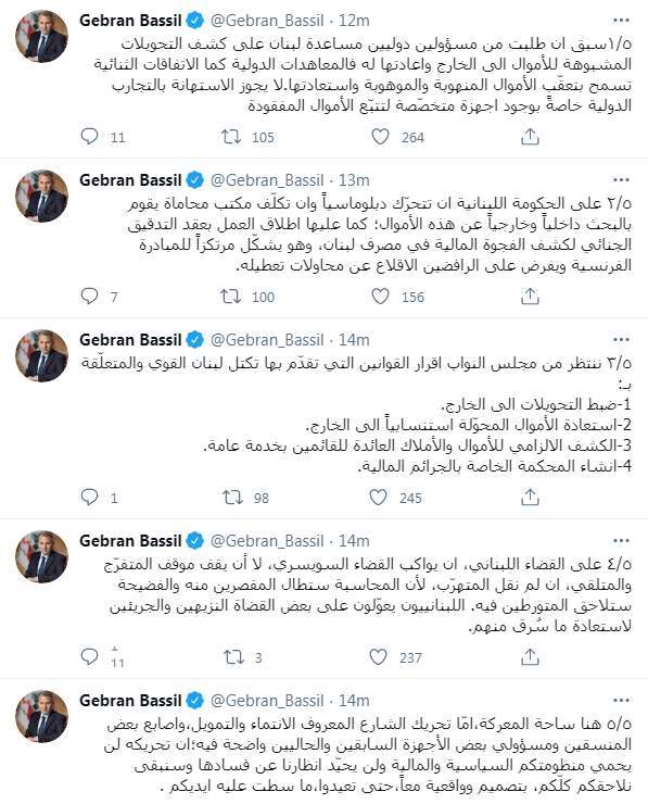 وكتب جبران باسيل تغريدة على تويتر "سبق أن طلبت من مسؤولين دوليين مساعدة لبنان على كشف التحويلات المشبوهة للأموال الى الخارج وإعادتها له فالمعاهدات الدولية كما الاتفاقات الثنائية تسمح بتعقّب الأموال المنهوبة والموهوبة واستعادتها.لا يجوز الاستهانة بالتجارب الدولية خاصةً بوجود اجهزة متخصّصة لتتبّع الأموال المفقودة"