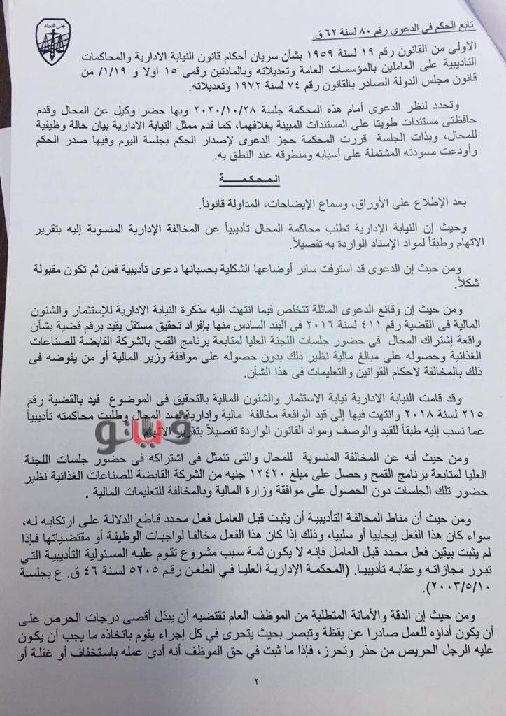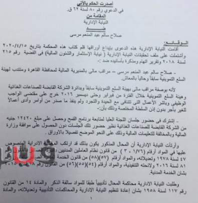 وأصدرت المحكمة حكمها بمجازاة صلاح سالم عبد المنعم، المراقب المالي بالمديرية المالية لمحافظة القاهرة بغرامة تعادل ضعف الأجر الوظيفي الذي كان يتقاضاه في الشهر عند انتهاء خدمته .
