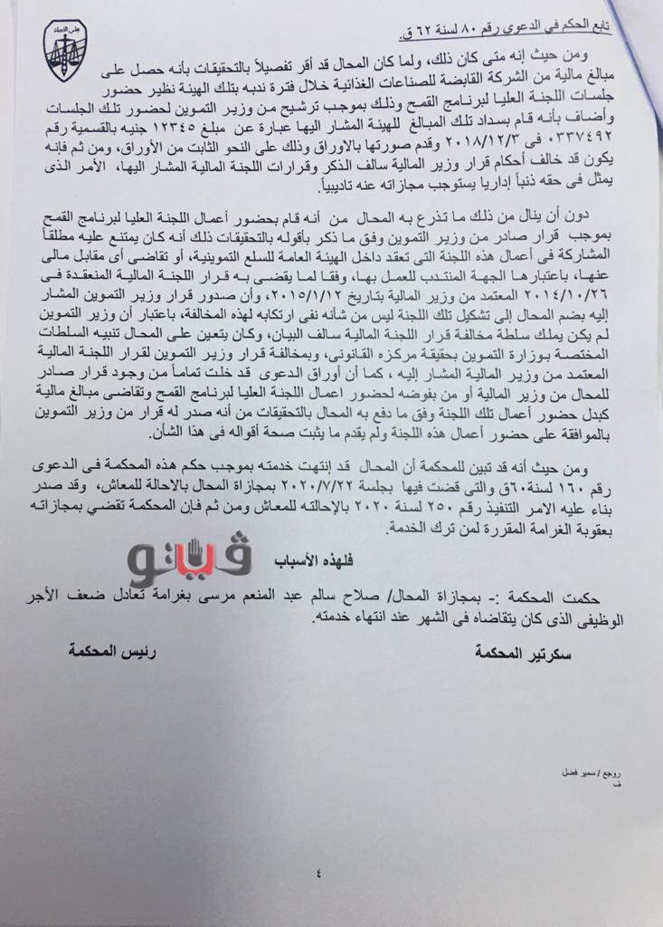 وكشفت حيثيات الحكم أن صلاح سالم عبد المنعم، المراقب المالي بالمديرية المالية لمحافظة القاهرة ومنتدب لهيئة السلع التموينية خرج على مقتضى الواجب الوظيفي وباشر الأعمال التي تتنافى مع الحيدة والتجرد ولم ينفذ ما صدر من أوامر وأدى أعمالًا للغير مقابل أجر بدون إذن السلطة المختصة .