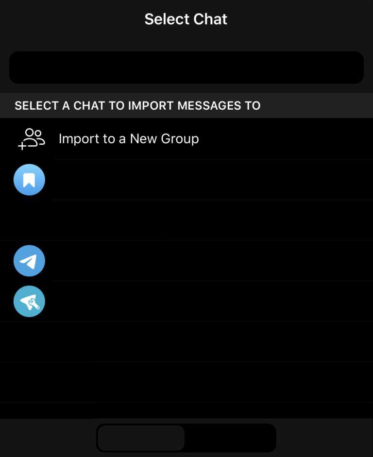 يجب تحديد تليجرام من صفحة مشاركة iOS ، سيسألك Telegram عن المكان الذي تريد استيراد الرسائل إليه يمكنك اختيار الدردشة الخاصة بك (الرسائل المحفوظة) أو مجموعة جديدة أو أي دردشة أخرى.