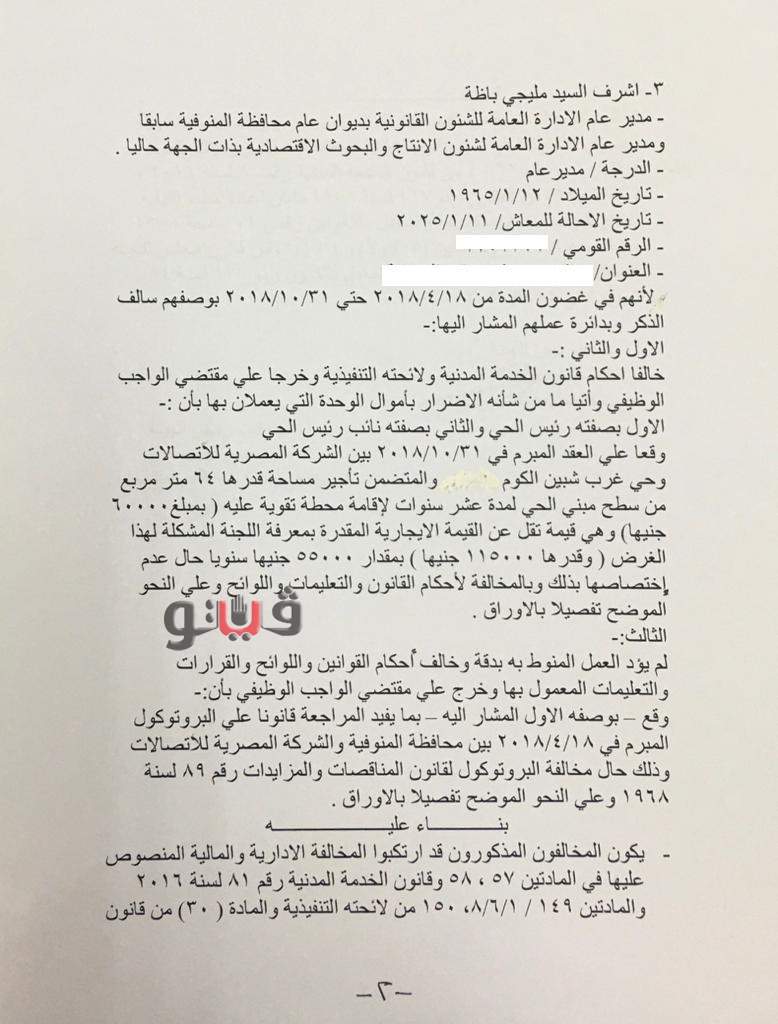 وكشفت التحقيقات أن المحالين خلال فترة عمل الأول رئيسًا لحي غرب شبين الكوم والثاني نائبًا لرئيس الحي وقعا على العقد المبرم في 31 أكتوبر 2018 بين الشركة المصرية للإتصالات وحي غرب شبين الكوم، والمتضمن تأجير 64 متر مربع من سطح مبنى الحي لمدة 10 سنوات لإقامة محطة تقوية عليه مقابل مبلغ 60 ألف جنيه رغم كونهما غير مختصين بذلك وبالمخالفة لأحكام القانون والتعليمات واللوائح بقيمة تقل عن القيمة الإيجارية المقدرة بمعرفة اللجنة المشكلة لهذا الغرض وقدرها 115 الف جنيه سنويًا