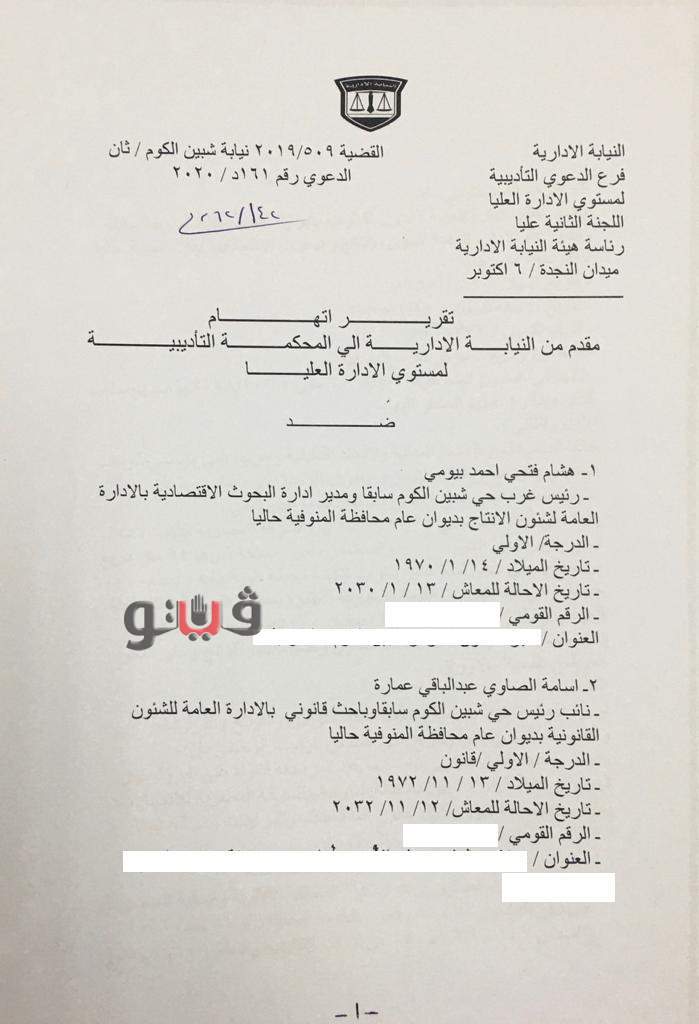 أكد تقرير الإتهام أن هشام فتحي أحمد، مدير إدارة البحوث الاقتصادية بالإدارة العامة لشئون الإنتاج بديوان عام محافظة المنوفية وأسامة الصاوي عبد الباقي، الباحث القانوني بالإدارة العامة للشئون القانونية بديوان المحافظة حاليًا خالفا أحكام قانون الخدمة المدنية ولائحته التنفيذية وخرجا على مقتضى الواجب الوظيفي وارتكبا ما من شأنه الإضرار بأموال الوحدة التي يعملان بها