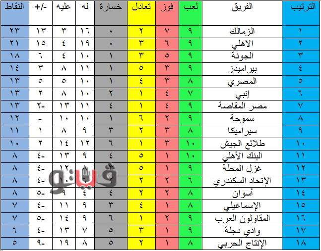 تنشر "فيتو" جدول ترتيب أندية الدوري المصري الممتاز، بعد انتهاء مباراتي اليوم الخميس، ضمن مواجهات الجولة العاشرة من المسابقة، والتي جاءت نتائجها على النحو التالي: