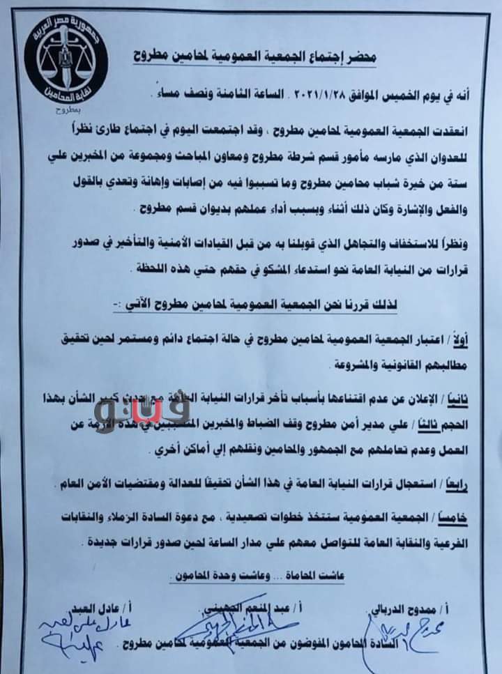 وكانت أعلنت الجمعية العمومية للمحامين - حسب محضر اجتماع لهم - بانعقاد اجتماع طارئ بسبب خلاف حدث بين ضابط بقسم شرطة مطروح وعددًا من المخبرين على ستة من شباب محامين مطروح وتسببوا في إصابات وإهانة وتعد بالقول والفعل والإشارة وذلك أثناء وبسبب أداء عملهم بديوان قسم مطروح.