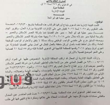 مجازاة مدير عام القضايا بـ"النصر للإسكان والتعمير" | مستندات